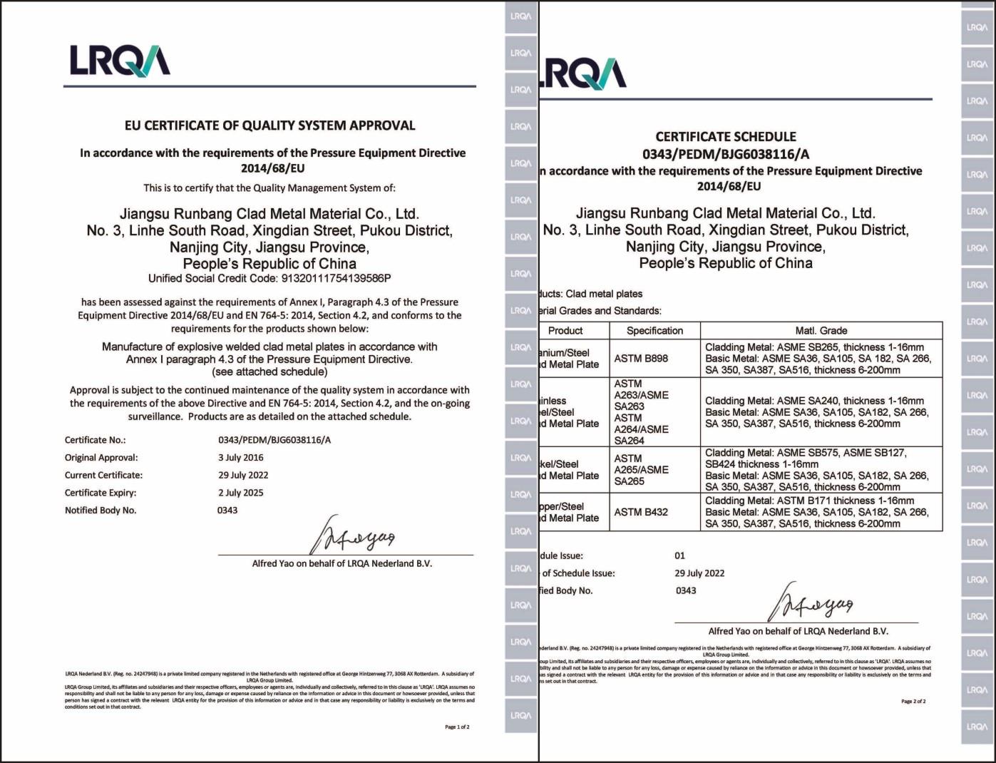 壓力容器用爆炸復合鋼板產品安全注冊證書